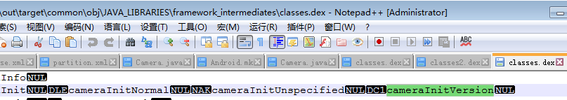 out\target\common\obj\JAVA_LIBRARIES\framework_intermediates\classes\android\hardware\Camera.class,然后生成framework_intermediates\classes\class.jar,再是framework_intermediates\classes\classes.dex和classes2.dex,接着是out\target\product\msm8937_64\system\framework\arm和arm64下的boot-framework.oat,在此文件中我们找到了cameraInitVersion()函数