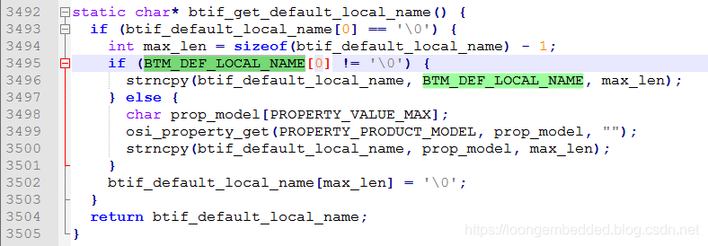 这里可以看出如果BTM_DEF_LOCAL_NAME的值不为空,那么蓝牙名称采用BTM_DEF_LOCAL_NAME来赋值;如果为空,则采用PROPERTY_PRODUCT_MODEL,