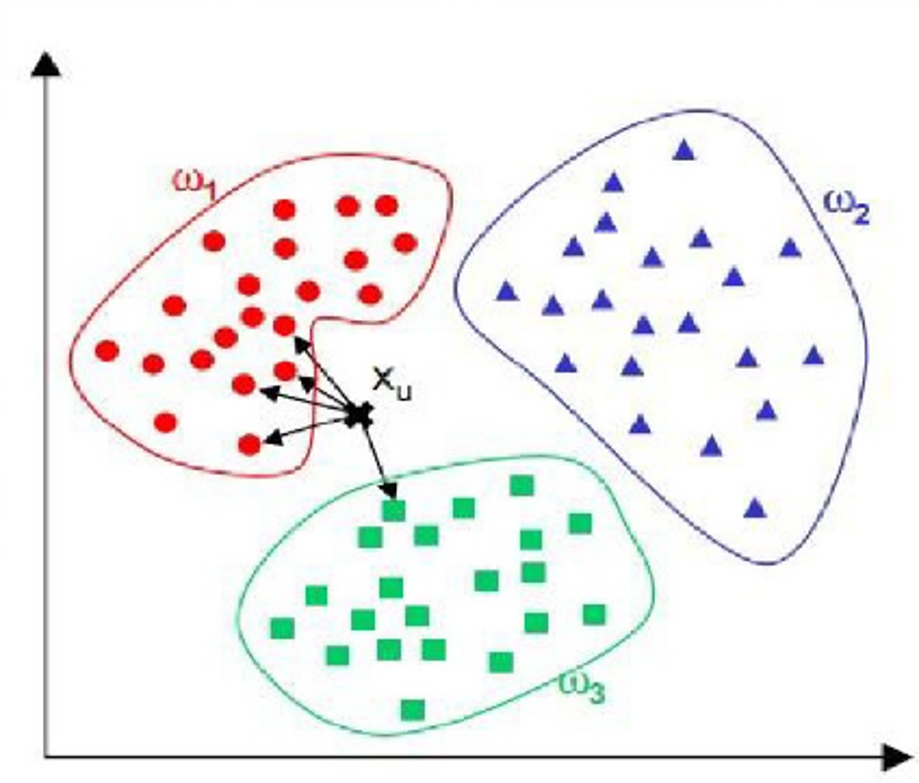 KNN,即K-nearest neighbor,翻译过来为k个最近的邻居,是一种最直接的用来分类未知数据的方法。其核心逻辑为:未知样本的类别由其周围 k 个最近邻样本的类别通过多数投票决定。算法无需预先训练模型参数,仅在预测时计算未知样本与所有训练样本的距离,选择距离最近的 k 个样本作为邻居,最终将邻居中出现频率最高的类别作为未知样本的预测类别。