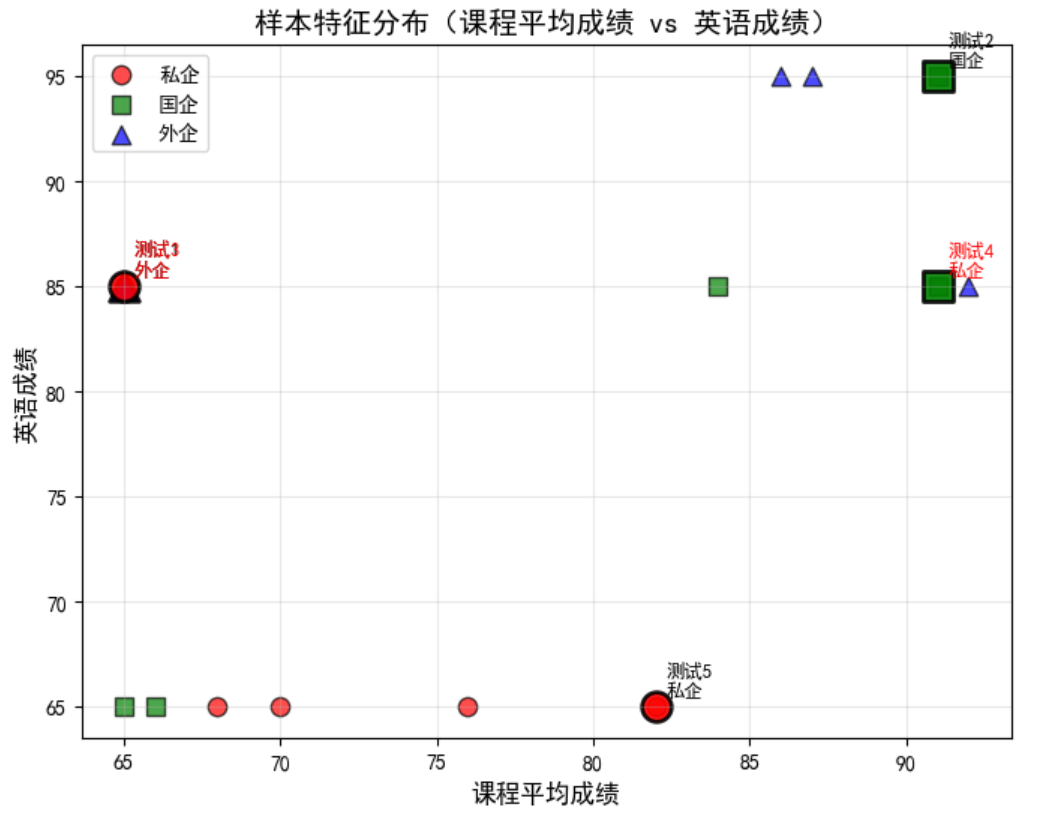 用 “课程平均成绩” 和 “英语成绩”(两个高权重特征)展示所有样本的分布,颜色 / 标记区分类别,黑色边框标注测试集样本;