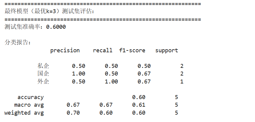 国企:精确率 = 1.00、召回率 = 0.50:模型预测为 “国企” 的样本全部是真实国企(精确率满分),但仅识别出 2 个真实国企中的 1 个。F1-score=0.67,综合表现较好。