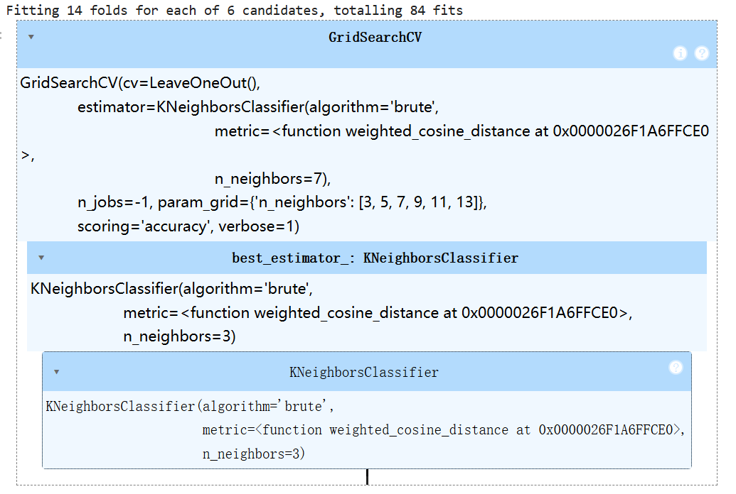 这段代码是初始化一个自定义距离的KNN分类器,核心是告诉 KNeighborsClassifier:“用我自己定义的加权余弦距离来计算样本相似度,并且用暴力搜索的方式找邻居”。KNeighborsClassifier 是 sklearn内置的K近邻分类器类 —— 它封装了 KNN 算法的核心逻辑(找邻居、投票分类),我们只需要通过参数配置,就能直接使用(不用自己写 “找 top-K 个邻居”“多数投票” 的代码)。