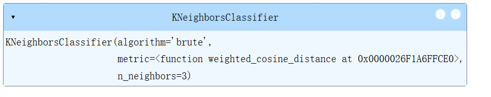 metric:sklearn 默认用「欧氏距离(Euclidean Distance)」,比如两个学生的特征向量直接算直线距离。这里自定义:weighted_cosine_distance,即不使用默认方法,用我们自己写的加权余弦距离函数判断样本到底像不像。
