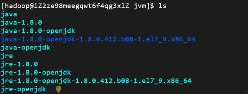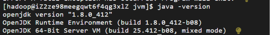 最后输出java -version,可以看到该输出显示系统中安装的是 OpenJDK 1.8.0_412 版本,这是一个正常的 Java 版本查询结果。输出内容包含了运行环境和虚拟机的具体构建信息,表明 Java 环境已正确安装并可正常使用。
