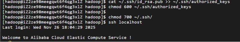 我的前车之鉴,启动 HDFS 时出现了 Permission denied(权限被拒绝) 错误,核心原因是 hadoop 用户缺少 SSH 免密登录本地服务器的权限。Hadoop 启动 start-dfs.sh 时,会通过 SSH 连接到本地节点(localhost 或服务器 hostname)来启动 NameNode、DataNode 等进程。但当前 hadoop 用户登录本地 SSH 时需要密码,且未配置免密登录,导致启动脚本无法自动完成连接,从而报权限错误。