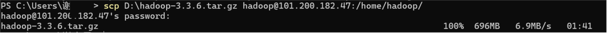 但下载速度太慢,于是我先下载到我的Windows电脑本地,再在powershell中通过scp命令(基于SSH的安全文件传输协议),上传到云服务器,存储在hadoop用户的/home/hadoop目录下