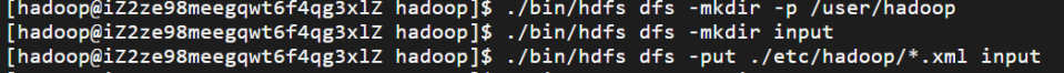 在此我们选择运行 grep 例子.在/usr/local/hadoop文件夹下新建文件夹input,然后将/usr/local/hadoop/etc/hadoop目录下的配置文件复制到input目录,命令: