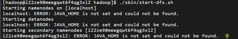 错误本质:Hadoop 启动脚本(如 start-dfs.sh)依赖 JAVA_HOME 来定位 JDK 路径,但当前系统中该变量未被正确设置或未被 Hadoop 识别。