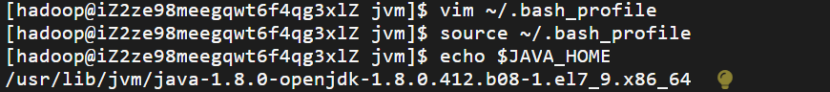 通过echo $JAVA_HOME,可以验证配置正确.该命令正常执行,输出了环境变量 JAVA_HOME 的值,显示为 /usr/lib/jvm/java-1.8.0-openjdk-1.8.0.412.b08-1.el7_9.x86_64。这表明系统中已正确配置并安装了指定版本的 OpenJDK 1.8。