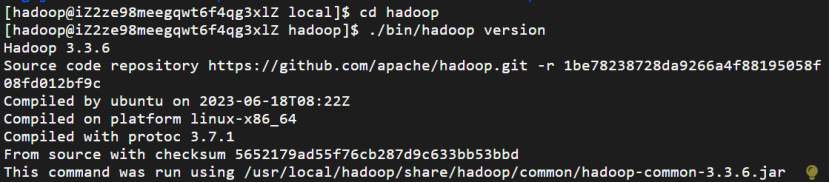 该输出显示 Hadoop版本信息,表明Hadoop已成功安装并运行。版本为3.3.6,编译时间为2023年6 月18日,使用的平台是linux-x86_64,并且提供了源代码仓库链接和校验码等详细信息。这是一个正常的命令执行结果,没有报错。