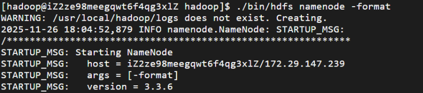 该日志显示 Hadoop 的 NameNode 正在执行格式化操作,并成功完成了初始化过程。