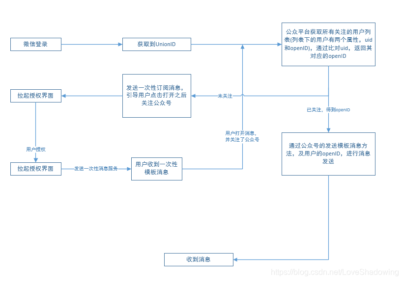 3、获取到关注用户列表之后,通过比对unionID,拿到对应的openID,通过openID调用发送消息的服务,发送消息