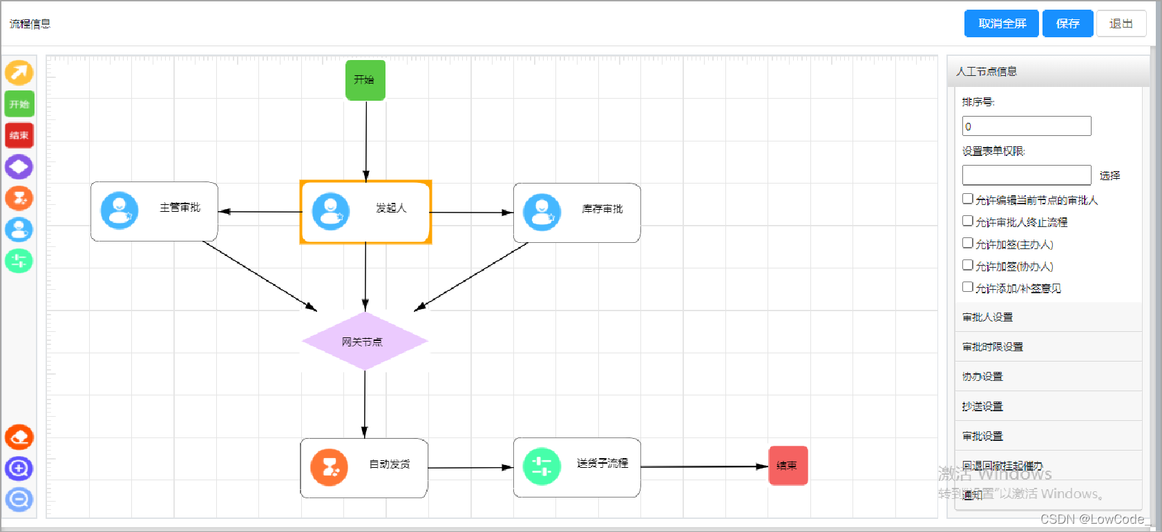 1. MyApps低代码开发平台的流程引擎为自主研发,遵循BPMN2.0规范;该平台拥有可视化拖拉拽流程配置界面,并且支持丰富的节点功能,其中包含人工节点、自动节点、子流程节点、关网节点、连接节点等。