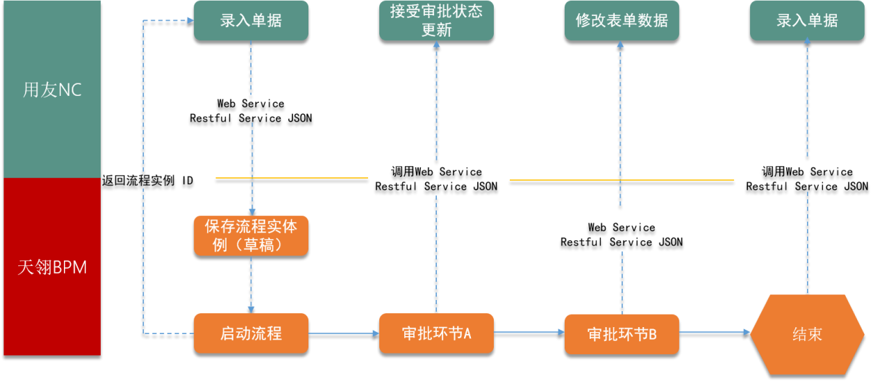 案例展示:与用友NC流程对接,业务数据在NC系统操作和存储,通过RESTFUL API接口调用天翎BPM流程引擎进行审批,审批状态实时传输回NC系统并按预定规则对单据信息和状态进行修改。