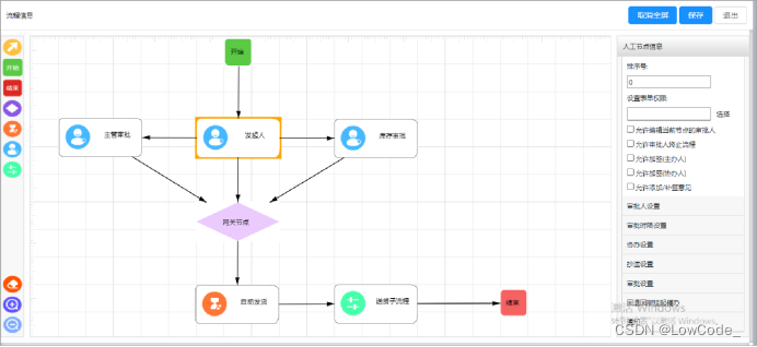国产老厂商天翎低代码平台MyApps的流程引擎为自主研发,遵循BPMN2.0规范;该平台拥有可视化拖拉拽流程配置界面,并且支持丰富的节点功能,其中包含人工节点、自动节点、子流程节点、关网节点、连接节点等。