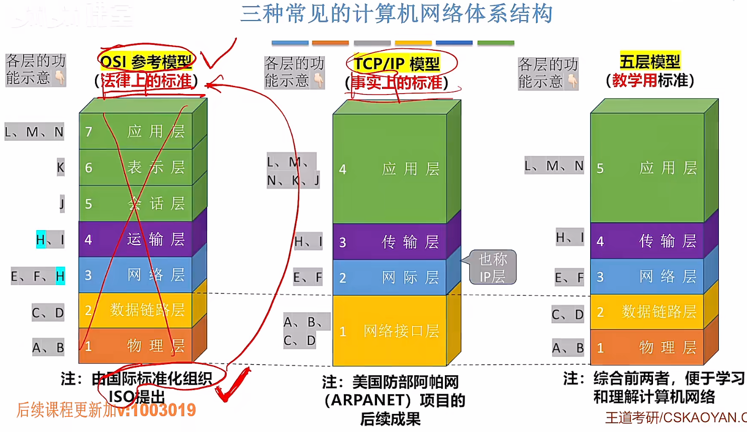 同样的道理,对于计算机网络来说,刚才我们提到了五层的这种结构。事实上,我们也可以把计算机网络设计成这种四层的结构,甚至七层的结构。这就引出了计算机世界中最常见的三种分层的结构,分别是七层、四层和五层的结构。最左边的七层结构是由国际标准化组织ISO提出来的,这种计算机网络的体系结构称为OSI参考模型,ISO是这个组织的名字,OSI是这个分层模型的名字。中间这种四层的设计是美国的国防部阿帕网这个项目的后续成果。阿帕网是世界上第一个现代计算机网络,阿帕网项目成功之后,又有一些科学家持续的投入去研究计算机网络,随着研究、研发的进展,最终就发展成了所谓的TCP/IP模型,这种体系结构就把计算机网络分成了四个层次。总之,ISO这个组织它提出了一种分层结构,而另一个组织又提出了四层的分层结构,分层只是第一步,除了分层之外,这两个组织还需要去安排和规划每一个层次需要实现什么样的功能,在OSI参考模型当中,同样一个功能可能会在多个层次中反复出现,而在TCP/IP这种四层的设计当中,每个层次承担的功能各不相同,很少会出现功能重复的情况,所以这就使得TCP/IP这种参考模型的设计会更简单高效一些,OSI参考模型当中,第五、六、七层要实现的功能在TCP/IP模型当中,被认为需要在第四层当中去实现。总之层次多,层次少,还有功能安排的合理不合理,都会使得这两种设计各有优劣。最终在市场的考验之下,现在统治整个互联网的是TCP/IP模型。我们现在的互联网世界就是被分为一、二、三、四这样的四个逻辑层次。OSI参考模型这种七层的设计思路,由于它最开始是一个国际组织提出的,所以这种OSI参考模型,它属于法律上的标准,一个权威机构、权威组织提出来的标准。这个国际组织在设计OSI参考模型的时候,其实是期望各个公司在生产设备的时候,都遵循我的这一套标准,让我的这套标准成为互联网的法规,但是事与愿违。由于这个孩子不太争气,所以最后还是打不过TCP/IP模型。因此TCP/IP模型是事实上的标准,而OSI 参考模型是法律上的标准。最后还有一种分层方式是五层模型,这种分层方式结合了前两种分层的优点,OSI参考模型对于网络层之下的两个层次解释的更清晰,研究的也更深入,同时也提出了很多很重要的概念。因此在教学上,为了让大家更容易理解整个计算机网络的工作原理。因此会综合 OSI参考模型和TCP/IP参考模型的优点,我们把计算机网络分成五层更便于学生去学习和理解计算机网络,所以大多数教材在介绍计算机网络的原理的时候都是按照这五层依次去讲解的。我们的计算机考研大纲也是按照这样的五个层次去划分的。在后续的章节当中,我们会依次展开了解各个层次,它需要实现哪些功能,以及每一种功能应该如何实现。在这我们提到了三种计算机网络的分层方式,或者说三种计算机网络的体系结构。