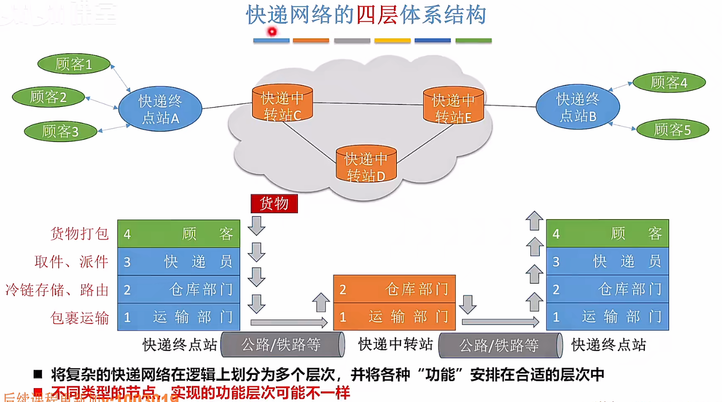 比如说我们可以把整个快递网络拆分成四层体系结构,快递终点站的最底层是运输部门,往上是仓储部门,第三层是快递员,第四层是顾客,我们可以让不同的层次去承担不同的功能。比如说第四层的顾客,让他去实现货物打包的功能,快递员让他去实现取件派件的功能,而仓库部门让他去实现冷链存储,还有快递的路由,最下层的运输部门让他去承担包裹运输的功能,每一个快递终点站都需要具备四个层次。相比之下,快递中转站这种中间节点,它只需要实现运输部门和仓储部门这两个层次的功能就可以,快递终点站和快递中转站之间会有公路、铁路或者航空路线等等,进行物理上的连接。在这种体系结构之下,一个包裹的的运输过程是这样的,首先寄件的顾客会负责把货物打包,打包好了之后,他会请求下一层的,也就是快递员上门取件,快递员取完件之后,他又会请求仓储部门的服务,让仓储部门比如说把这个货物进行冷链的存储,然后委托仓储部门把这个货物路由发到下一个节点去。紧接着,仓储部门会请求运输部门的服务,把这个包裹用汽车、飞机等等,用一种合适的方法给它运输到下一个站点。运输部门会把这个包裹送到下一个快递中转站。大家平时肯定都关注过自己包裹的物流信息,当包裹到达一个中转站之后,它会入库,就进入中转站的仓库,然后再由仓库部门决定你的包裹下一站应该发送到哪个位置,也就是说仓储部门要完成下一次的包裹路由。确定了包裹下一站要发到哪个位置之后,仓储部门又会请求下一层的运输部门的服务,让运输部门把你的包裹再运往下一个站点,如果包裹到达了快递终点站,运输部门会把包裹交给仓储部门,仓储部门又交给快递员,快递员又交给顾客,这样就完成了一个货物的运输。可以