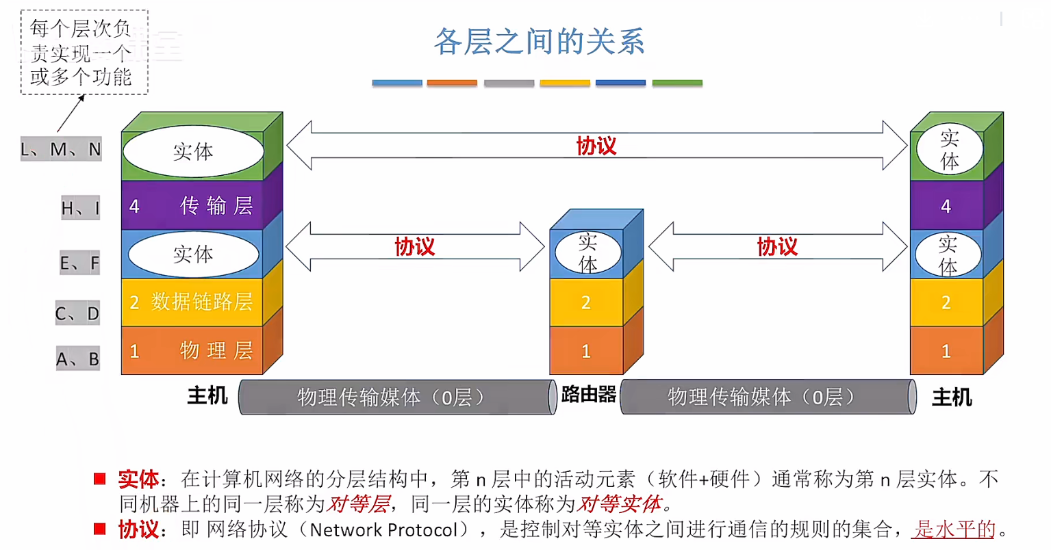 由于我们接下来教学使用的是五层的分层方式,所以接下来的讲解我们尽量以五层模型为标准。接下来,我们简单的认识一下各层之间的关系。我们刚才说,我们对计算机网络的功能进行层次的划分,每一层实现一个或者多个功能。我们把分层结构当中第n层的活动元素,把它称为第n层的实体。什么意思?比如说我们要实现第五层的功能,那么会有一些软件模块,以及一些硬件模块工作在第五层,我们把涉及到第五层功能的这些软件和硬件把它看作是第五层的所谓的活动元素,这些东西就是所谓第五层的实体,同样的道理,为了实现第三层的功能而存在的那些软件、硬件就是第三层的实体。每一个结点都会对应若干个层次,而每一个层次都会对应一个所谓的实体。在两个不同结点当中,处于同一层的实体称为对等实体,比如说在左边主机和右边主机两个节点当中处于第五层的两个实体,称为对等实体。同样的道理,同处于第三层的三个实体也都是对等实体。刚才我们说过网络协议的设计是为了去实现某一种功能,网络协议它是控制对等实体之间进行通信的规则的集合。也就说对等实体之间的通信需要遵循某一种协议,只有遵循这个协议的规定,才可以确保可以实现某种功能。所以所谓的网络协议,它是约束了对等实体之间的通信规则,这种约束是水平的、水平方向的,这是水平视角。
