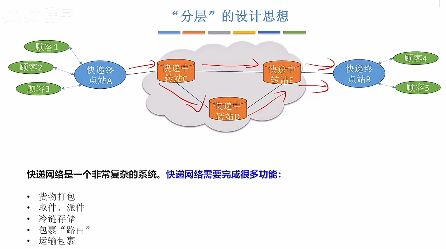 首先来看分层的设计思想,从我们最熟悉的快递网络出发,在你家附近会有一个快递终点站,就是你的包裹最终会放到这个终点站,然后由这个终点站的快递员为你派送包裹,一个终点站它会为很多个顾客服务。在其他的城市,也会有这种快递终点站,终点站和终点站之间会有很多快递中转站组成的快递网络,负责转运包裹。这就组成了一个完整的快递网络,这个快递网络需要实现很多功能,它是一个非常复杂的系统。比如说这个快递网络需要承担货物打包的功能,也需要承担取件派件的功能,对于一些特殊的货物运送,这个快递网络可能还需要支持冷链存储的功能。另一方面,一个顾客给另一个顾客寄送包裹的过程当中,这个包裹可以转运的路径是不是有很多条,比如说我们可以走上面这条路转运,也可以走下面这条路转运,到底要选择哪一条转运的路径,这是不是和我们计算机网络非常类似,我们不妨把给包裹规划转运路径的这个功能,称为包裹的路由。最后这个快递网络还需要提供包裹运输的功能,到底是用飞机运输、汽车运输还是火车运输等等。有很多需要考虑的细节问题。除了上面这些功能之外,这个快递网络还有很多很多乱七八糟的功能还需要去实现,这儿就不再赘述。