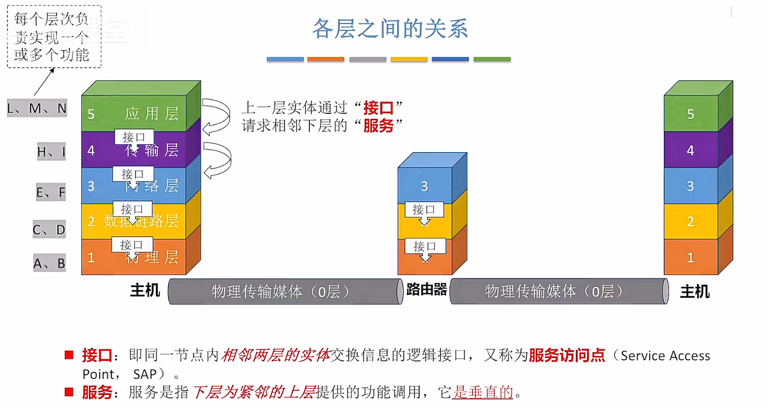 接下来从垂直的视角来看,我们的上一层实体会通过下一层实体提供的接口,去请求下一层实体的服务。比如说应用层想要传输层提供I这个功能。他就需要去访问I这个功能对应的接口,可以简单的理解为函数调用的过程,一个函数会对外展现出它的调用接口,只需要去访问这个函数的调用接口,这个函数就会为你提供相应的功能、服务。只有相邻的两个层次才拥有服务和被服务的关系。上一层请求相邻的下一层提供服务,反过来说,下一层会为相邻的上一层提供服务。所以服务这个概念是垂直的,想要请求下一层的服务,我们可以访问下一层提供的接口,这个接口又可以称为服务访问点,英文缩写叫SAP。所以在这个地方我们又引入了两个新的概念,分别是接口和服务。
