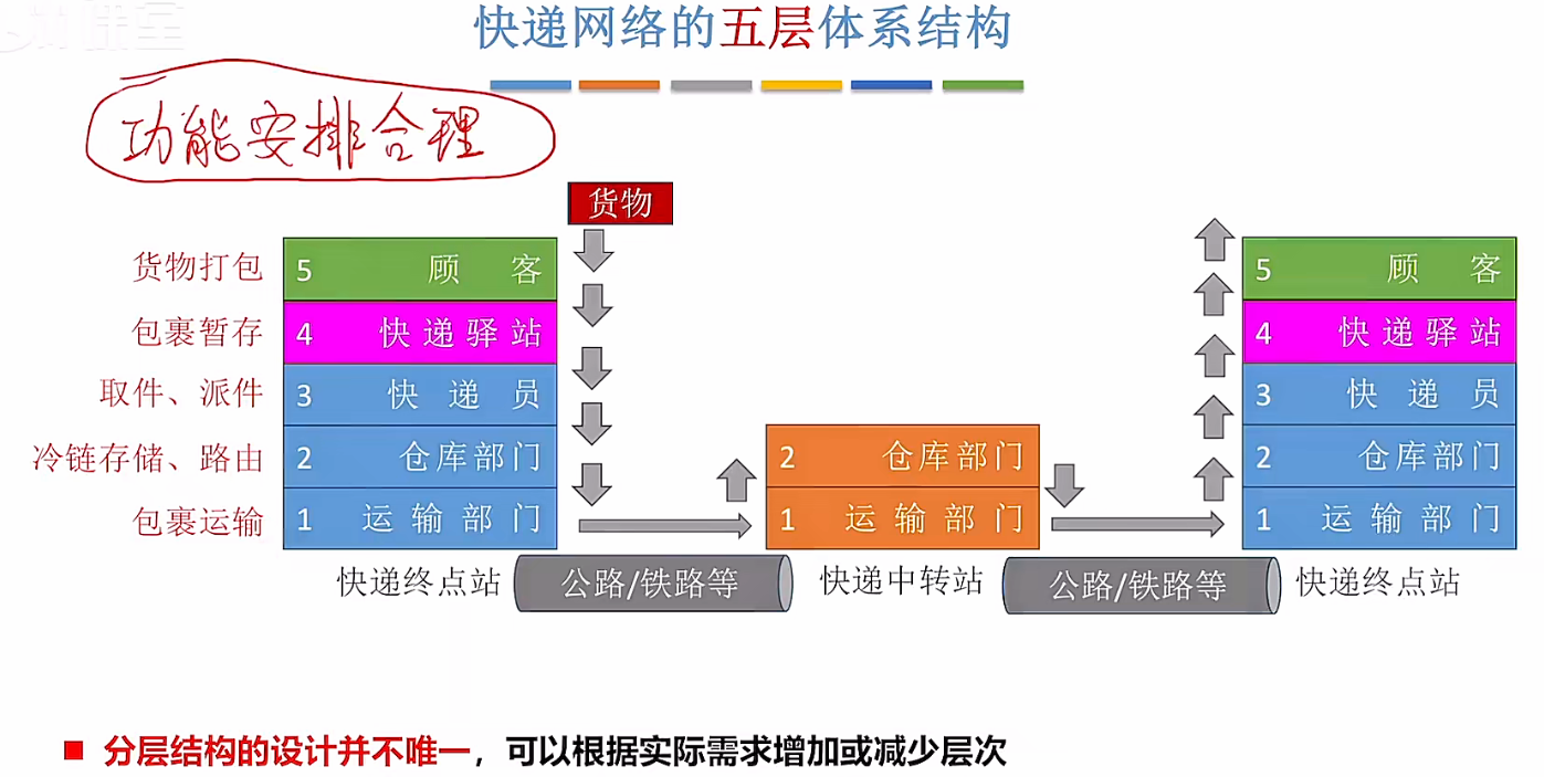 接下来我们思考这样的一个问题,快递网络的分层设计只能设计为四层结构吗?不是,我们也可以让这个快递网络增加一些层次,比如说在快递员和顾客之间,增加一层叫做快递驿站,顾客要寄件的时候先把包裹放到快递驿站,快递驿站再把包裹交给快递员,相应的收件方在接收包裹的时候,快递员先把包裹放到快递驿站,最后再由快递驿站把包裹交给顾客。所以我们也可以采用这样的设计,得到一个五层的快递网络体系结构,也就是说这种分层结构的设计,其实并不唯一,只要我们能够把各种功能合理的安排到每个层次当中就可以。我们一直在强调这些功能的安排必须合理,一定要放到合适的层次,让合适的层次去实现,什么叫功能安排不合理呢?比如说如果我们把派件的这个功能,把它交给运输部门去实现,这就意味着运输部门的卡车司机,除了包裹运输之外,还需要去派件,这样的设计就是不合理的。所以我们把一个复杂系统的功能拆分出来之后,这些功能应该在哪个层次中去实现,这也是整个系统的设计者需要考虑的问题。