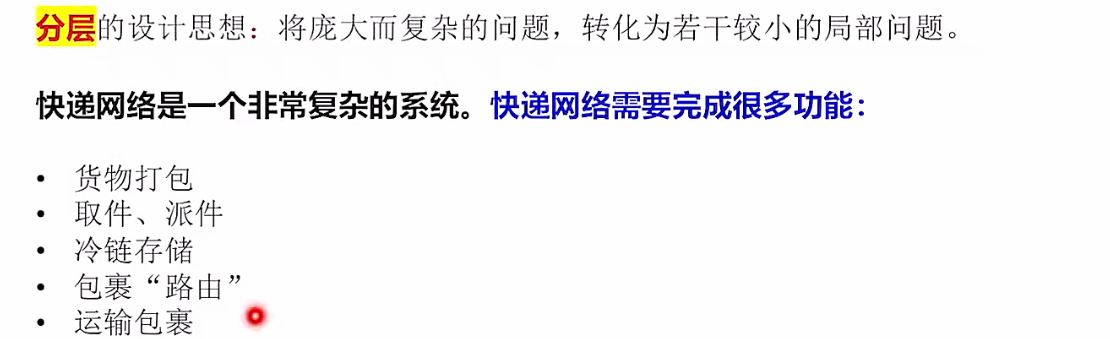 在这个视频中,我们会介绍计算机网络的分层结构,首先我们会以大家熟悉的快递网络为例,带大家感受分层设计的思想,紧接着我们会介绍计算机网络的三种常见的分层结构。最后,我们会简单的介绍各层之间有什么关系。