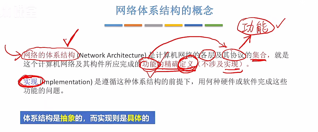 接下来我们给网络的体系结构一个比较精确的定义,所谓网络的体系结构是计算机网络的各层,以及各层的协议的集合,每一层需要支持若干个协议,而每一个协议又会对应的实现若干个功能。所以协议的存在是为了实现功能,因此计算机网络体系结构本质上就是对计算机网络及其构建所应完成的功能的精确定义。当我们设计一个计算机网络体系结构的时候,我们只需要精确的定义出分为几层,每一层需要实现哪些功能,每一个功能需要有什么协议去实现,只需要定义出这些东西就可以了,不涉及到实现的问题,具体的实现问题是交给软硬件的厂家去实现的,各个厂家只需要遵循给出的体系结构的设计,生产出来的设备,开发出来的软件就可以在我的计算机网络当中去运行。所以网络体系结构它是一个抽象的概念,而体系结构定义的功能层次的实现,是一个具体的问题。