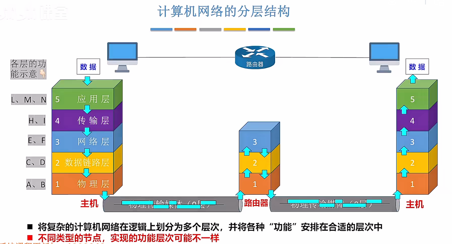 比如说,我们不妨把计算机网络分成五个层次,第一层是物理层,第二层叫数据链路层,第三层叫网络层,第四层是传输层,第五层是应用层。我们现在先不管为什么各个层次要叫这样的名字,反正每一层我们给它取个名,层次划分好之后,接下来我们把刚才提到的A、B、C、D、E、F、G那些各种各样的功能安排到合适的层次当中。比如说我们可以这么安排,让第一层物理层实现A、B两个功能,第二层数据链路层实现C、D两个功能,上面的各层也会分别承担相应的功能,在计算机网络当中,我们会要求所有的主机节点都要实现第一层到第五层的所有功能,而不同类型的节点,比如说路由器,我们只要求它实现第一层到第三层的功能,主机和路由器之间会通过物理传输媒体进行连接。比如说网线、光纤等等,我们不妨把物理传输媒体看作是第0层。在这样的结构之下,数据的传输是这样的:数据的发送方准备好数据之后,会把这个数据先交给应用层,数据经过应用层的处理之后再交给传输层,传输层再进行一些加工处理,交给网络层,以此类推逐层往下,数据每经过一个层次,都会被这个层次进行相应的处理,最后这些数据会被转换成电信号或者光信号,在物理传输媒体上进行传输,传输到下一个节点,下个节点收到数据之后会把这个数据逐层往上进行处理,第三层处理完之后,再把数据逐层往下递交,紧接着,经过下一条物理链路进行传输,最终数据到达目的主机,并且被逐层的往上进行处理,最终交付给目的主机的用户。这是数据传输过程的大致示意图,形式上和快递网络货物传输的过程是类似的。
