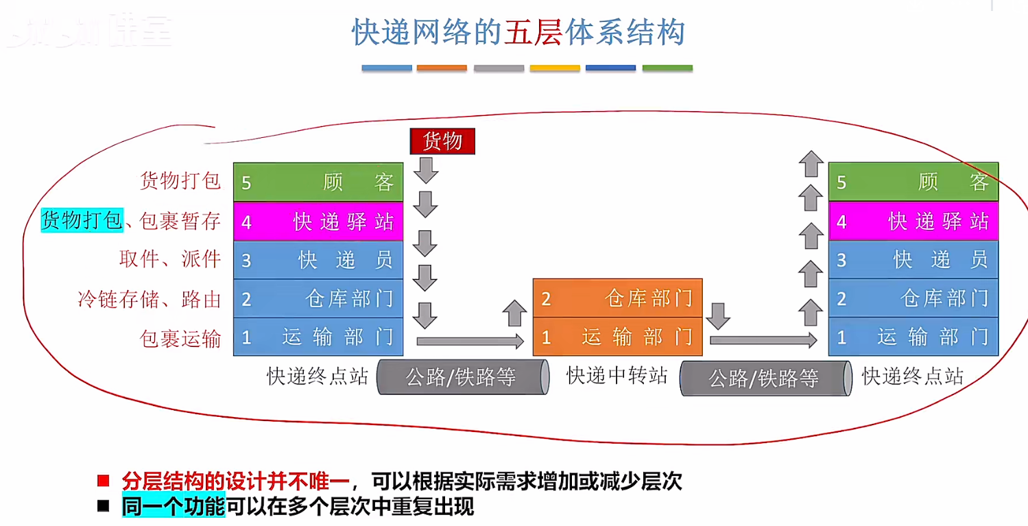 另外有一些功能,我们可以把它安排在不同的层次当中,让它重复的出现,比如说可以让第五层的顾客去完成货物打包的功能,当然也可以要求快递驿站去完成货物打包的功能,这都是可以的,所以同样一个功能在不同的层次当中反复的出现,这也是在设计中被允许的,从这个例子当中,我们能够深切的感受到这个快递网络,我们可以把它设计成四层的体系结构,也可以设计成五层的体系结构,只要我们保证这些功能的安排是合理的就可以了。另外同一个功能也可以在不同的层次当中反复的出现。