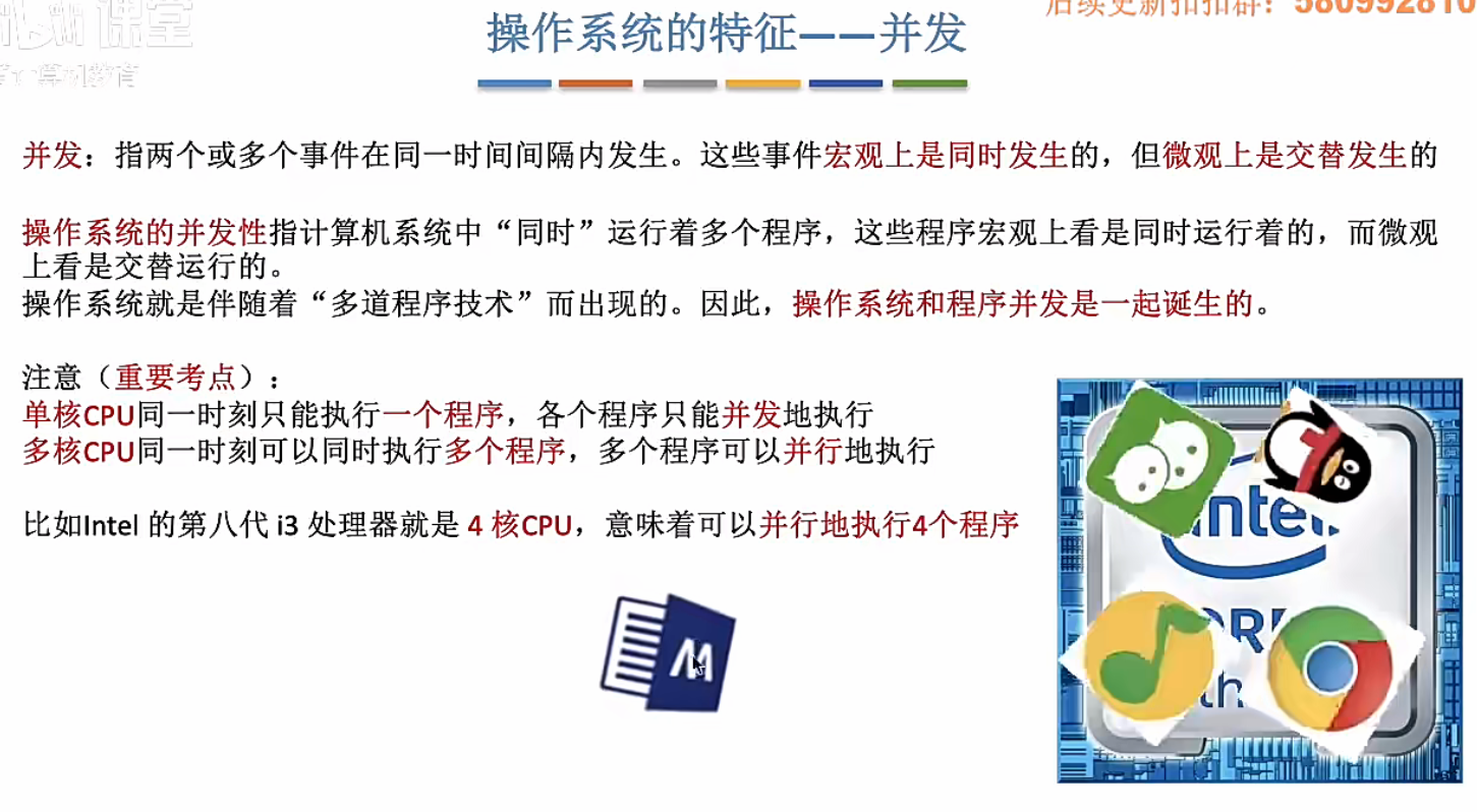 操作系统的并发性指的是,在计算机当中同时运行着多个程序,这些程序宏观上看,它们是同时运行着的,但是微观上看是交替运行的。接下来看为什么并发性对于操作系统来说是一个很重要的基本特性。操作系统是伴随着多道程序技术出现的,这个会在下个小节操作系统的发展历史当中有进一步的介绍。总之,操作系统的出现,就是为了支持多道程序并发运行、同时运行而诞生的。需要注意一个很重要的考点,对于一个单核CPU来说,同一时刻只能执行一个程序,因此,一个单核CPU的系统当中,各个程序肯定是只能并发的执行。但对于多核CPU来说,同一时刻可以同时执行多个程序。也就是说,多个程序可以并行的执行。举个例子,我们的英特尔第八代i3 处理器,它就是一种四核的CPU,四核CPU就意味着它可以并行的执行四个程序。比如说在上图CPU上,可以同时并行的运行微信、QQ、word还有Goodle这四个程序。但是如果此时有第五个程序,也想同时运行,比如说我们想听歌的话,就必须剥夺其中的某一个程序对CPU的使用权,比如说把word这个程序给换下CPU,然后让QQ这个程序上CUP运行,然后word和QQ这两个程序交替着来使用CPU。总之,对于四核CPU来说,同一时刻只能同时执行四个程序。如果要有超过四个以上的程序同时运行的话,并发性依然是必不可少的,所以不管是早期的操作系统,还是现代的操作系统,并发性都是操作系统一个很重要的、最基本的特性。