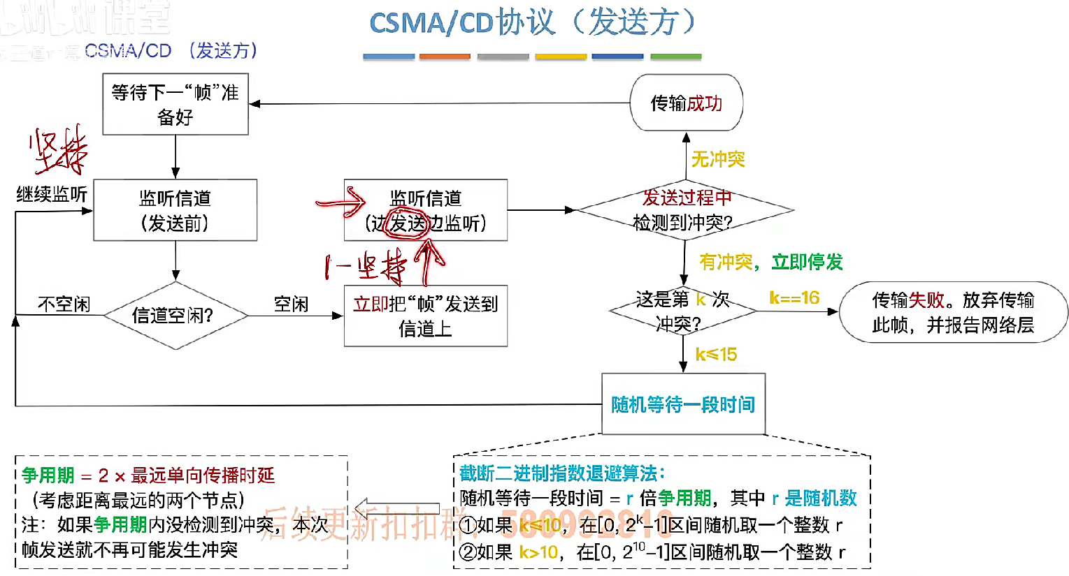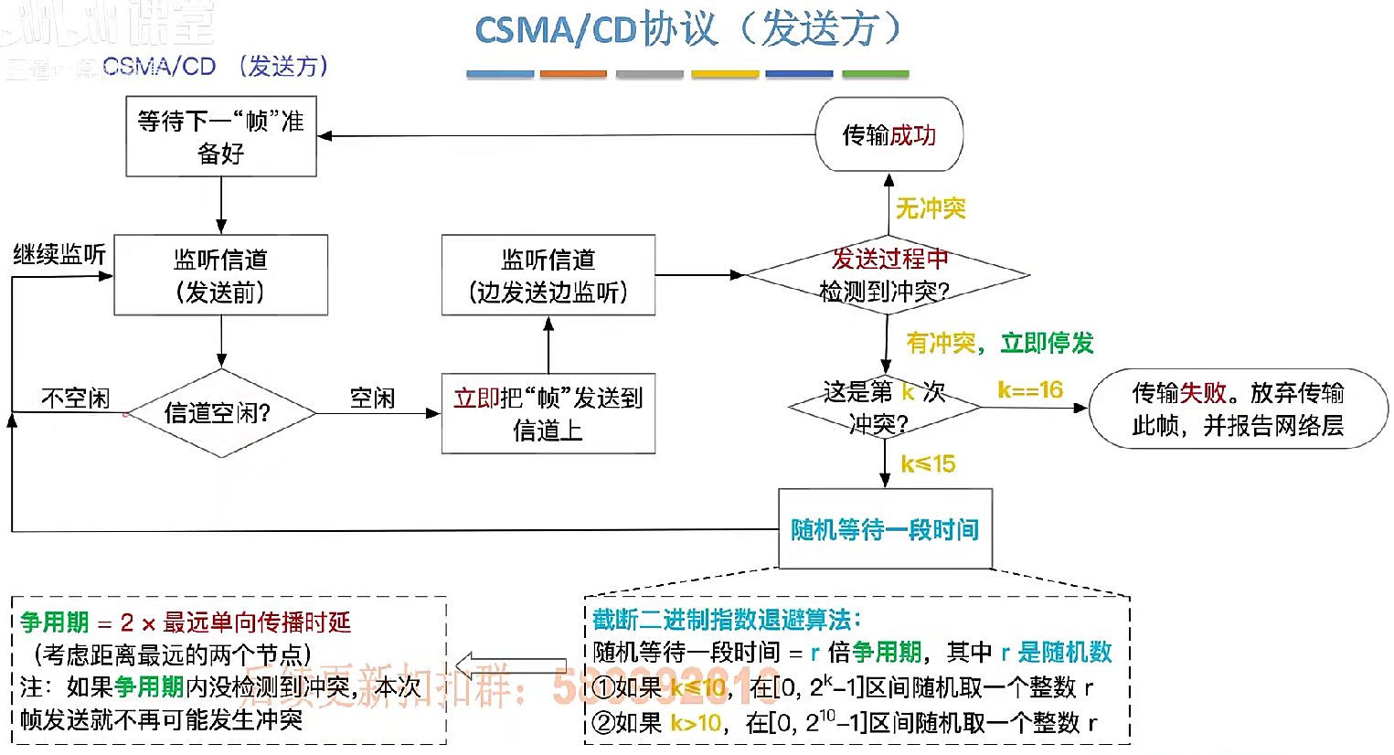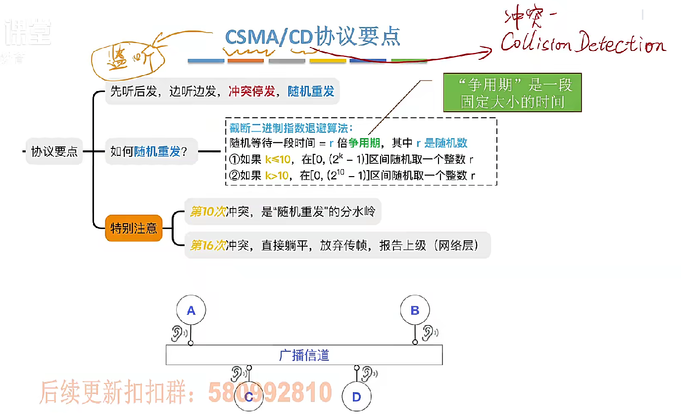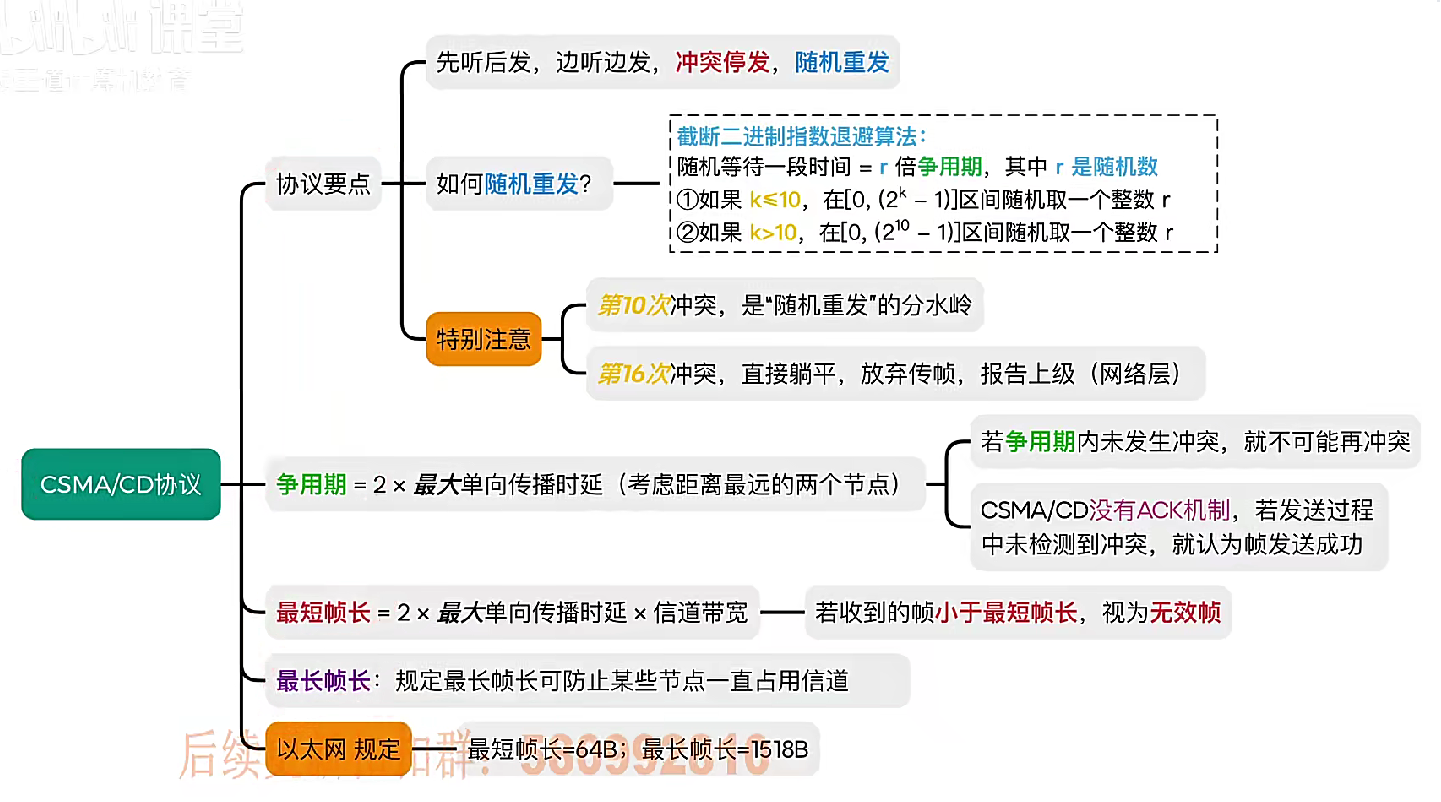 由于这个协议的内容比较多,为了降低大家的记忆负担,比较重要的东西都总结在了这张图里,接下来会从上至下依次去展开讲解。首先来看一下CSMA/CD协议的一些要点。