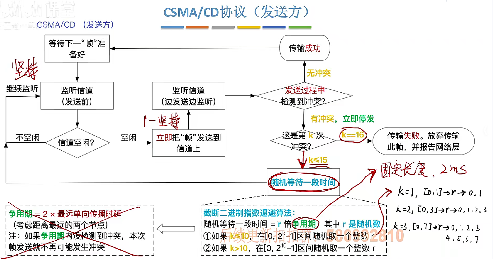 理,这个一会再展开探讨,如果说在整个发送的过程当中都没有检测到冲突,也就是发送的过程当中没有监听到其他节点发来的数据,或者说信号,就说明数据帧是能够传输成功的,当一个数据帧传输成功之后就可以去传输下一个数据帧。接下来探讨发生冲突的时候,应该怎么处理。首先需要判断这是第几次发生冲突,如果当前发送的这个数据帧已经是第16次发生冲突了,是不是就说明此时网络可能非常的忙,网络的负载特别高,在这种情况下,就会直接放弃传输当前的数据帧,紧接着把情况报告给网络层。这是冲突的次数特别多的情况,如果冲突的次数还不是特别多,冲突的次数k小于等于15 的话,我们会用一种算法确定一个随机的时间,等待这段随机时间之后,再重新尝试发送当前的数据帧。