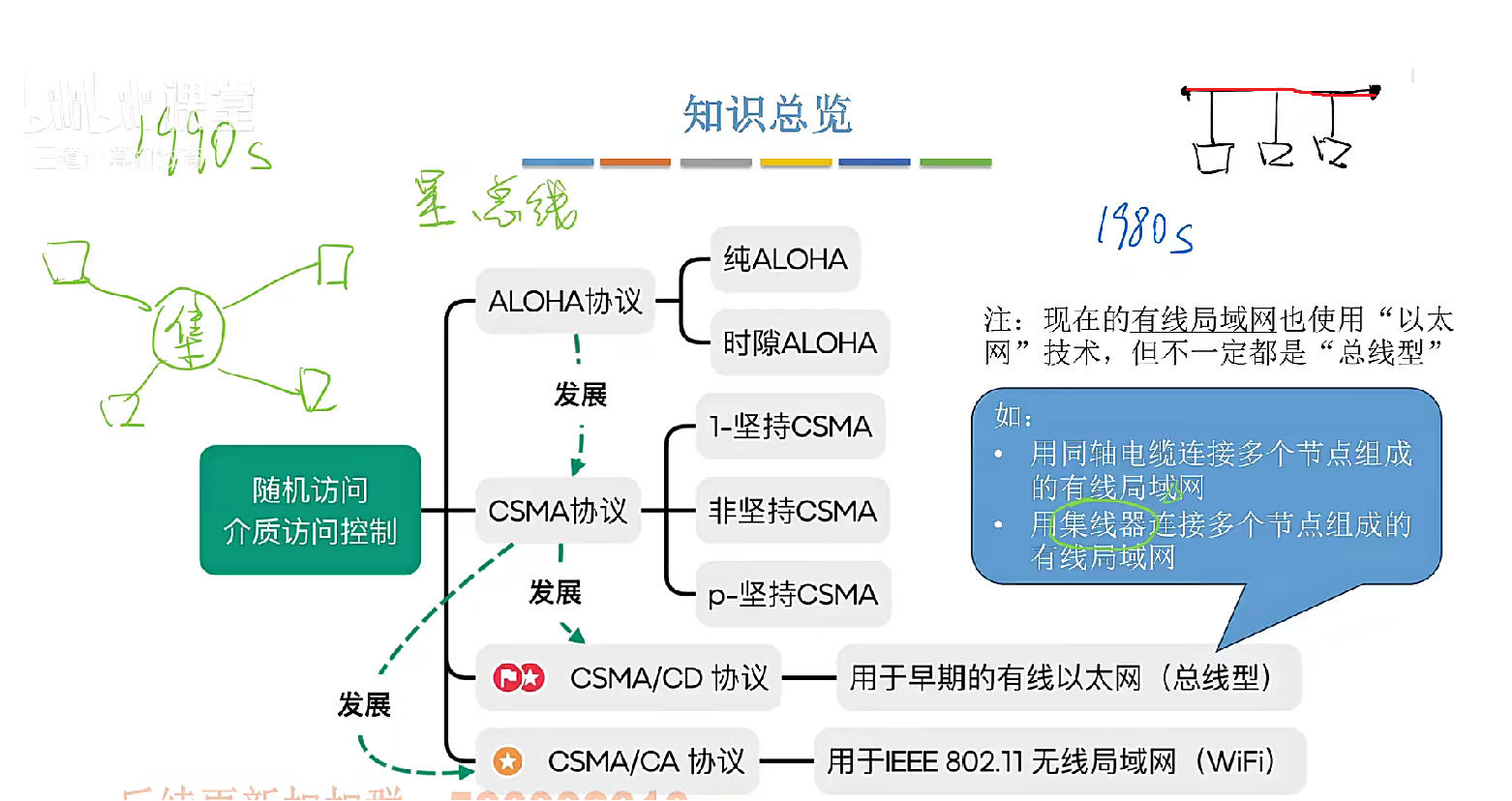 继续来看随机访问介质访问控制。在之前的学习中介绍了ALOHA协议和CSMA协议,其中CSMA 协议又可以进一步的细分为1-坚持、p-坚持和非坚持这样的几种类型。