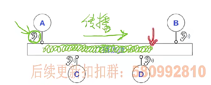 首先解释一下CSMA这个缩写是什么意思?通过之前的学习我们知道CSMA这个英文缩写的意思是载波监听,这一段缩写当中最重要的一个隐含的特性就是监听,也就是任何一个节点在发送数据之前,需要先监听信道,只有信道空闲的时候才会发送数据,这么做可以降低冲突的概率,这是监听 的特性,接下来看CD, CD指的是Collection Detection,也就是冲突检测的意思。所以CSMA/CD 这种协议是在CSMA协议监听机制的基础上,再增加冲突检测的新的机制。来看一下这个协议是怎么工作的,总结起来一句话:先听后发,边听边发,冲突停发,随机重发。首先先听后发这个特点我们在CSMA协议当中其实有过介绍。什么意思呢,比如现在B结点正在往信道上发送数据,B节点发送的数据会充斥整个信道,与此同时,如果A节点也想要发送数据,在发送数据之前,它会先监听信道,通过监听发现此时信道不空闲,于是A节点暂时不发送数据。在CSMA/CD协议当中,如果信道此时不空闲,节点会持续监听,也就是它具备坚持的特性,会坚持监听,直到信道空闲的时候,就会立即把自己的数据帧发送到信道上,也就是说CSMA/CD协议具备1-坚持的特性。信道不空闲的时候坚持监听,当信道空闲的时候会以1的概率立即把帧发送到信道上,所以CSMA/CD 协议,本质上是1-坚持CSMA协议的一个进化版本。回到刚才这个故事,根据刚才的分析我们知道,A节点会持续监听信道,直到某一个时刻B节点撤销了自己的信号,此时A节点发现信道空闲,于是他会把自己的信号发送到信道上,这就是第一个特性先听后发。