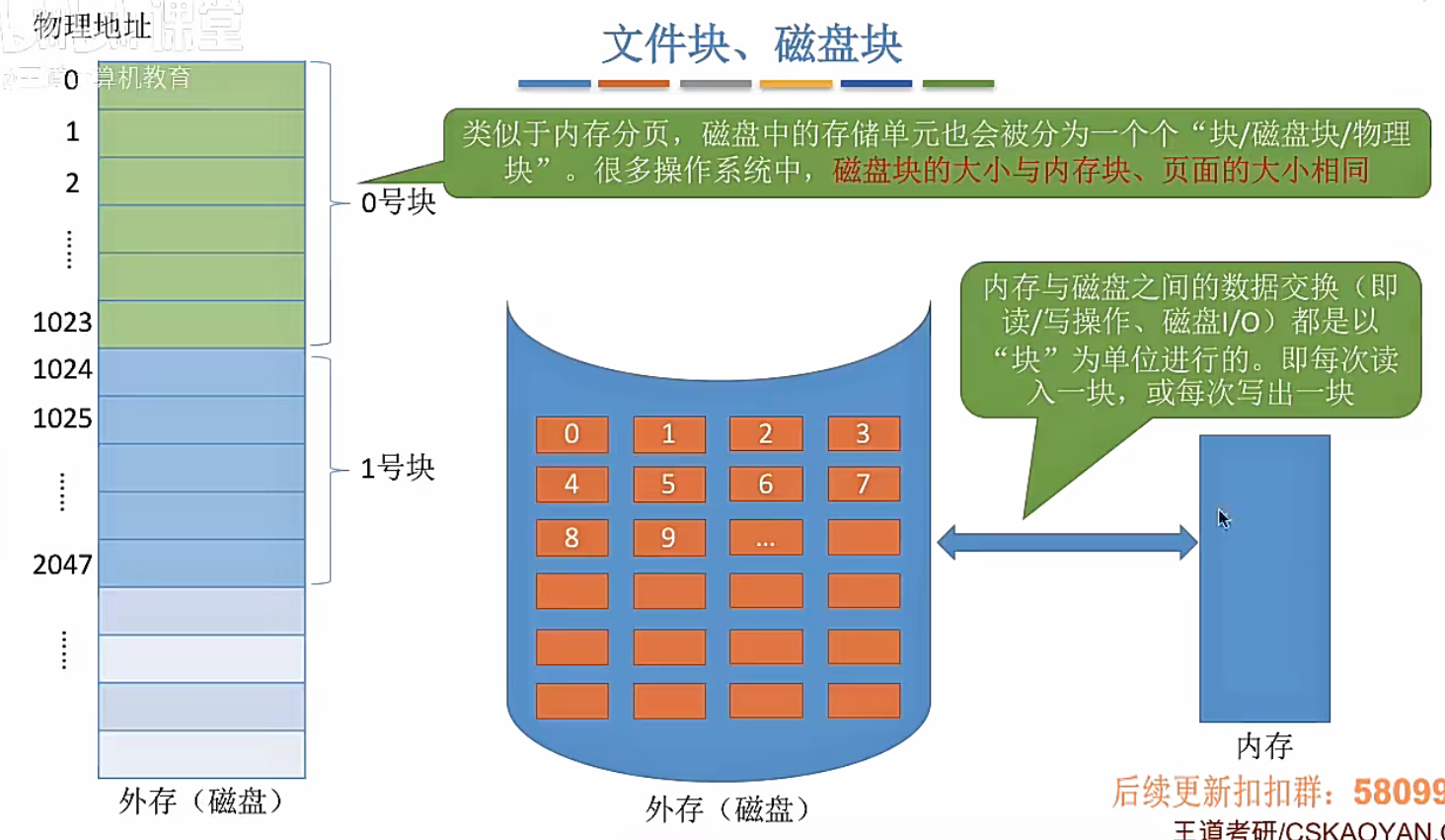 在正式开始之前,我们需要先补充几个比较重要的知识点。在之前我们简单的提到过类似于内存分页,磁盘中的这些存储单元会被分为一个个大小相等的块,这些块也可以称为磁盘块或者物理块,相应的,系统也会为这些磁盘块进行一个编号,像这个是零号块,这个是一号块,以此类推。另