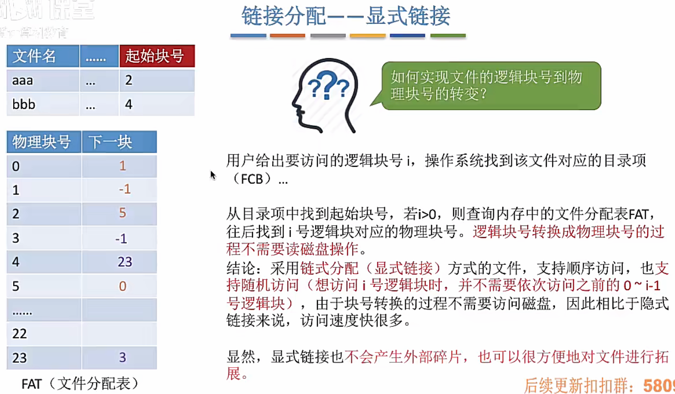 理块当中的,接下来会继续查询这个表象,发现一号逻辑块的下一块,也就是二号逻辑块是存放在零号物理块当中的,于是查询到这个位置就知道,这个用户想要访问的aaa这个文件的二号逻辑块存放的物理块号了。由于FAT它是常驻内存的,因此查询FAT的过程并不需要读磁盘操作,所以通过这个分析,我们得出这样的结论,采用显式链接的链接分配方式的话,这种文件它既支持顺序访问,也支持随机访问,我们想要访问 i 号逻辑块,并不需要顺序的依次访问零到i- 1号逻辑块,可以直接通过FAT表查到 i 号逻辑块存放的地址,并且由于这个查询的过程并不需要访问磁盘,所以相比于隐式链接的那种方式来说,采用显式链接,访问速度会快很多。显然这种方式也不会产生外部碎片,并且可以很方便的实现对文件的拓展。