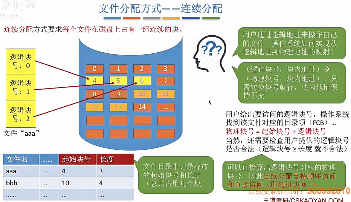 我并不需要访问其他的这些块,我可以直接找到逻辑块号二存放的位置,所以这是顺序访问和直接访问的含义。支持直接访问或者说随机访问也是连续分配方式最大的一个优点。