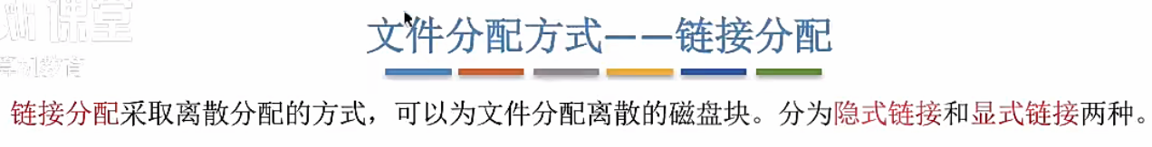 接下来看第二种文件分配方式,链接分配,链接分配采取的是离散分配的这种思想,可以为文件分配离散的磁盘块,然后用指针链接的方式把这些磁盘块都给串联起来,而链接分配方式又可以进一步分为影视连接和显式链接两种。