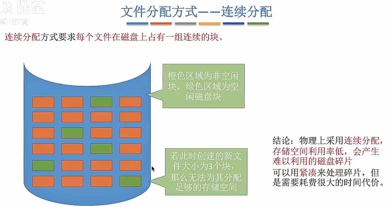 再来看第二个缺点,假设此时在这个图当中,橙色的这些区域表示的是非空闲块,而绿色的这些区域表示的是空闲磁盘块,此时会发现这总共有五个空闲的磁盘块,假如说此时要创建一个新文件,这个文件的大小需要占用三个磁盘块,由于这个文件它采用的是连续分配的方式,因此由于此时整个磁盘当中并没有连续的三个空闲块,因此我们没有办法为这个文件分配足够的这个存储空间。相应的,假设这个系统当中有很多文件都是大于一个块这么大小的,这些空闲的、离散的块就很难被利用起来,所以如果说物理上采用这种连续分配的方式的话,存储空间的利用率会低,会产生难以利用的磁盘碎片,而这些磁盘碎片就有点类似于在之前内存管理当中讲过的那种外部碎片,处理这些碎片的方式也和处理外部碎片的思想是一样的,可以用紧凑的方式来解决。不过紧凑就意味着需要移动大量的这些磁盘块的内容,这个过程是需要花费很大的时间代价的,因此会产生磁盘碎片这个问题,也是连续分配方式一个很明显的缺点。