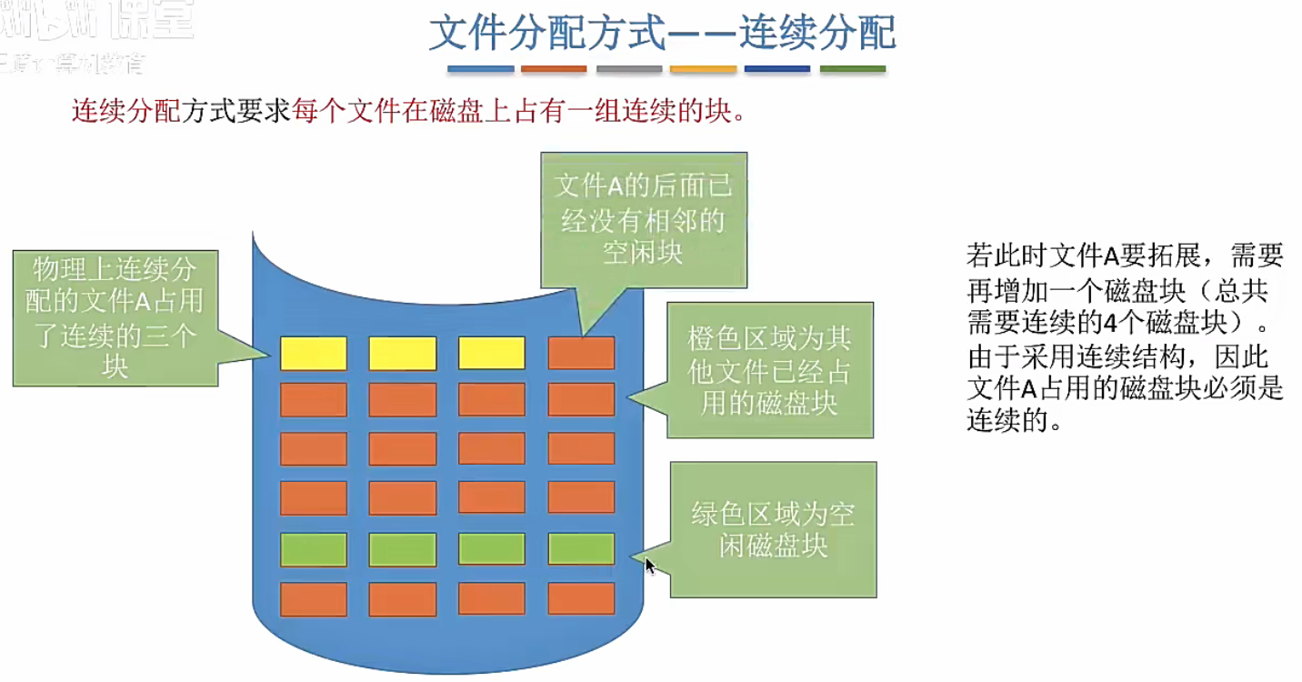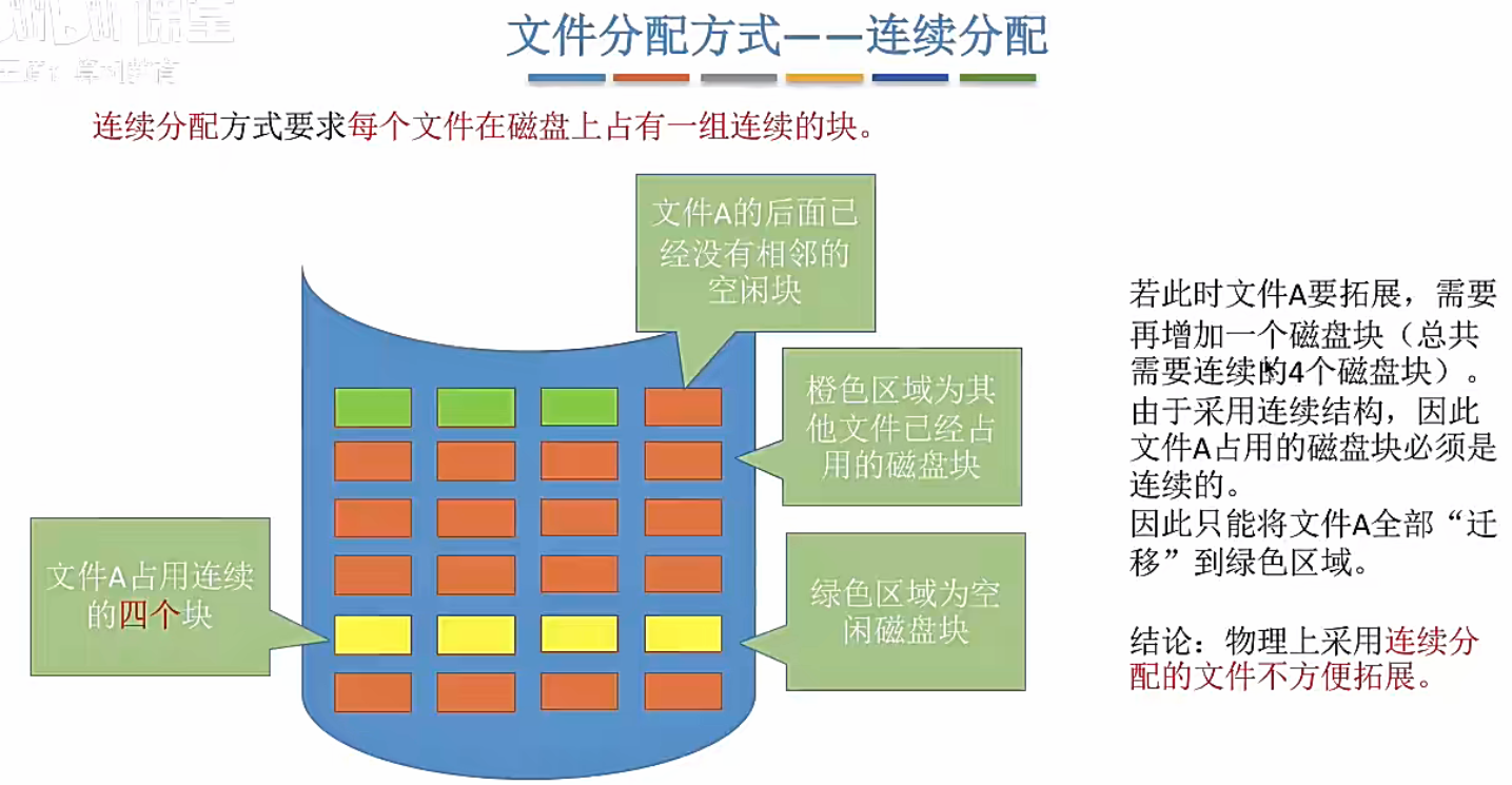 接下来看一下连续分配方式有哪些缺点?假设在这个图当中,黄色的部分是一个文件a所占用的连续的三个块,绿色的部分是空闲的块,橙色的区域表示其他的文件已经占用的磁盘块,如果说此时文件a想要拓展,也就是说想要再增加一个磁盘块的话,由于连续分配要求为一个文件分配的是连续的块,而文件a后面的这个相邻的块,此时已经被别的文件所占有了。因此如果要拓展文件a的话,我们不得不把文件a的数据整体的迁移到另外的这个有连续的四个块的这个区域当中。