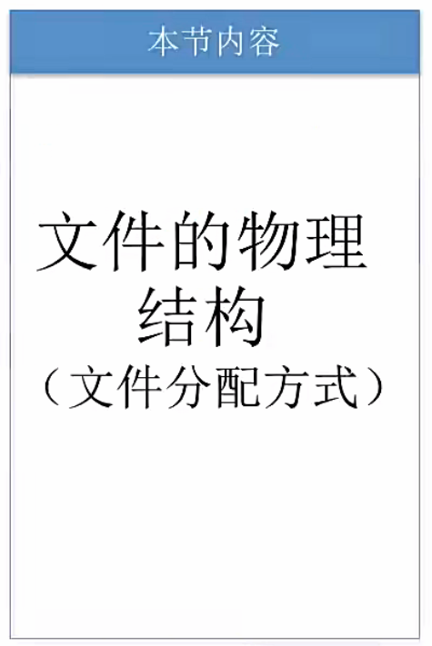 这个小节开始学习文件的物理结构,也就是文件分配方式相关的一系列问题,这个小节的内容十分重要,在历年的考试当中,都经常出现两到三题的选择题,甚至经常会在大题当中进行考察,所以这个小节的内容会讲的比较细致,会补充一些课本上没有提到的点。