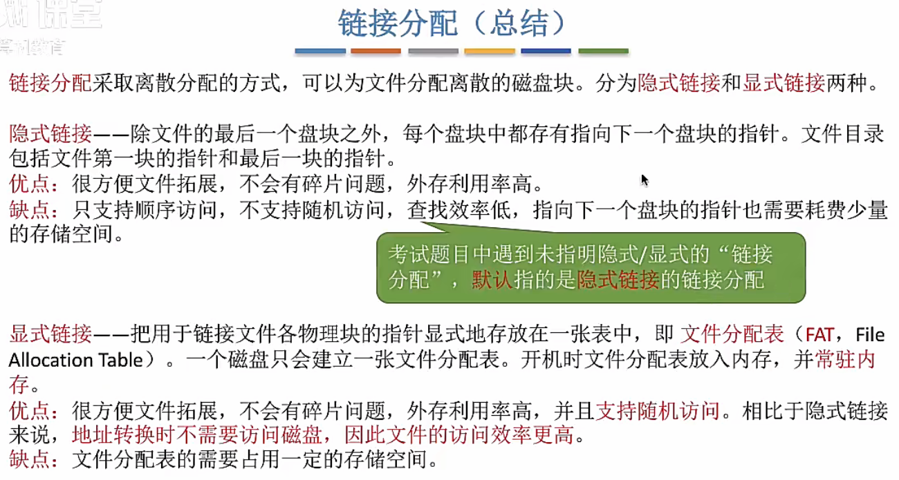因此通过这一系列分析,我们知道了显式链接的优点和缺点,我们需要特别注意的是,一个磁盘只会对应一张文件分配表,并且在开机的时候,这个文件分配表就会被读入内存,并且常驻内存,因此查询文件分配表的过程并不需要读磁盘操作,所以这也造就了显式链接方式支持随机访问,并且在这个地址转换的过程当中,访问效率更高的一个特点。不过它的缺点就是这个文件分配表需要占用一定的存储空间。大家需要注意的是,如果题目当中没有明确的告诉我们到底是显式链接还是隐式链接,如果它只是简单的提到链接分配的文件,我们默认它指的是隐式链接的链接分配方式。