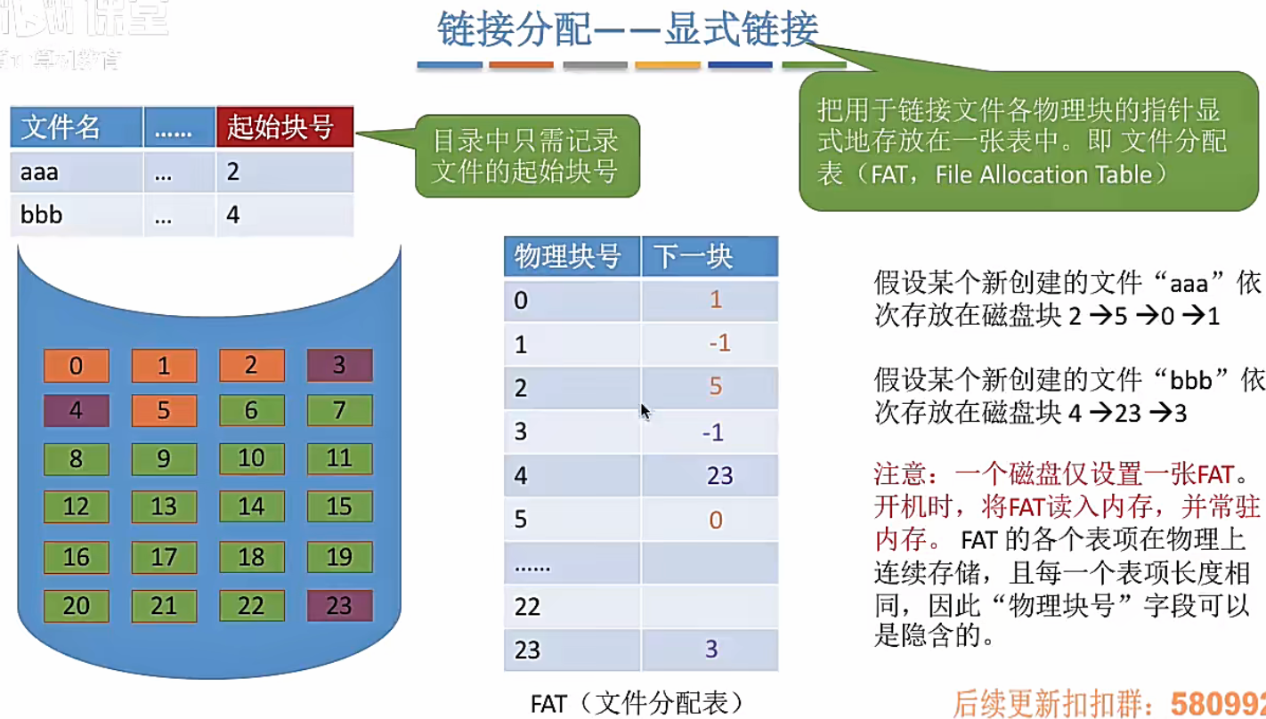 接下来我们再来看显式链接的链接分配方式,这种方式会把用于链接文件各个物理块的指针,显示的存放在一张表当中,这个表就被称为文件分配表,英文缩写是FAT,磁盘当中的各个块的先后顺序都是统一记录在文件分配表当中的,所以一个磁盘它有多少个块,在这个文件分配表当中就相应的会有多少个表象。假设此时有一个新创建的文件,文件名是aaa,它依次占用了2、5、0、1这样的几个物理块,在aaa这个文件的FCB,也就是目录项当中,需要记录这个文件aaa它存放的起始块号,起始块号是二号块,另外在这个文件分配表当中会显示的记录文件aaa它这几个物理块的一个链接关系。比如说二号块是起始块,二号块的下一块是五号块,所以FAT的这个表象,二号块的下一块就应该记录为五,五号块的下一块是零号块,所以五号块的下一块,这个表象记录为零,零号块的下一块是一号块,所以这个地方记录为一,而一号块是最后一个块,所以一号物理块的下一块这个数据可以把它设置为一个特殊的值,比如说是负一,用来表示这就是这个文件的结尾。这样的话就完成了2、5、0、1这样的一个顺序的记录。同样的,假设有一个文件bbb,它依次存放在4、23和3这样的几个盘块当中,bbb这个文件对应的FCB当中需要记录它的起始块号是4号块,4号块的下一个块是23,所以这个表象应该记录为23,23号块的下一块是3号块,所以这个地方记录为3,3号块是文件的末尾,所以这个地方记录为负一。这样的话也完成了bbb这个文件4、23、3这样的一个顺序的记录。所以这种方式把每个文件的各个盘块的链接信息显示的、统一的放在了这样的一个文件分配表FAT当中,所以这是它为什么称作显式链接的一个原因。从这个地方可以看到,一个磁盘仅需要设置一张FAT就够了,每个文件的这些盘块的先后顺序都是统一的存放在这张表当中的,并且在开机的时候,FAT文件分配表它会被读入内存,并且会一直常驻内存,而FAT的这些一个一个的表象在物理上是需要连续存储的,并且每一个表象的长度相同,比如说下一块这个数据可以用四个字节来表示,所以物理块号这个字段可以是隐含的。