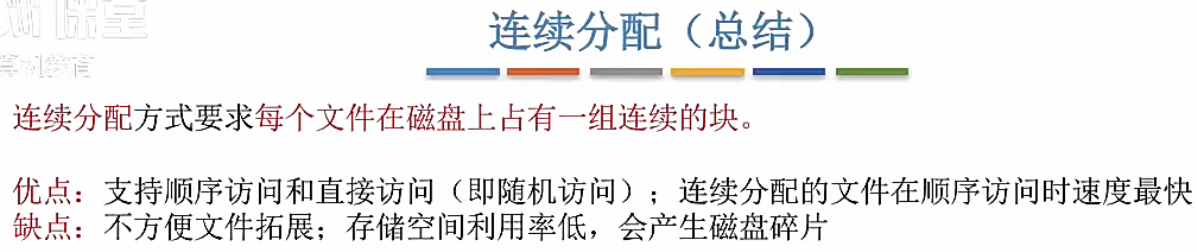 所以连续分配方式要求每个文件在磁盘上占用一组连续的块,它的优点是支持顺序访问和直接访问,也就是随机访问,并且连续分配的文件在顺序访问时速度是最快的,但是它也有一些缺点,就是不方便文件的拓展存储空间,利用率低,会产生磁盘碎片。这是连续分配方式需要掌握的一些知识点。