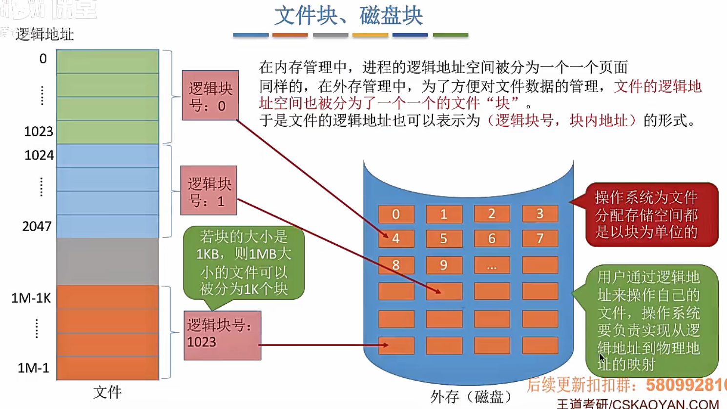 在之前内存管理那个章节中,我们学习过进程的逻辑地址空间会被划分为一个一个的页面,这样可以方便操作系统对进程进行管理。相应的,在外存管理当中,为了方便对文件数据的管理,文件的逻辑地址空间也会被划分成一个一个大小相等的文件块,因此文件的逻辑地址也可以表示为逻辑块号和块内地址的形式,这就类似于一个进程的逻辑地址可以表示为页号和页内地址的形式,就像左图这个样子。假设这个系统当中一个物理块的大小是1KB,一个1M 字节大小的文件就可以分割为 1K个块,所以这个文件的逻辑括号应该是从零到一零二三,总共1K个块号,并且每一块的大小都是1KB这么大,因此用户在操作自己的文件的时候,可以用逻辑块号,还有块内地址这样的形式,就可以定位到自己文件当中的任何一个位置。这个文件的数据被分为一个一个的逻辑块之后,操作系统为文件分配存储空间也都是以块为单位进行的,比如说逻辑块号为零的这个块被放到了物理块号为四的这个磁盘块当中,然后逻辑块号为一的这个块放到了这个位置,逻辑括号为一零二三放到这个位置。不过用户对于自己的文件的这些各个逻辑块到底存放到了什么地方,这个信息用户是不可知的。因此,用户在操作自己的文件的时候,是使用的是逻辑块号和块内地址这样的形式,于是