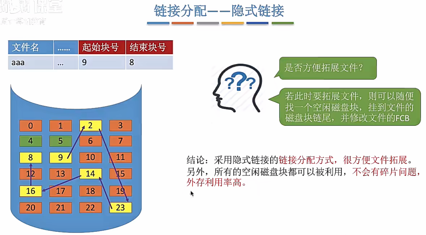 接下来考虑下一个问题,采用这种方式是否方便拓展文件呢?假设此时这个文件需要拓展,也就是需要再给它分配一个新的磁盘块,由于这个文件的这些块可以是离散分配的,因此只需要从这个磁盘中随便找出一个空闲的块,把它挂到这个文件的链尾就可以了。比如说此时给文件再新分配了一个八号块,于是把八号块挂到这个链的链尾,操作系统会修改这个文件FCB的结束块号这个内容,把结束块号设为八号。所以可以看到采用这种方式的话,文件的拓展是很方便的,并且这种方式不会产生碎片问题,外存的利用率很高。