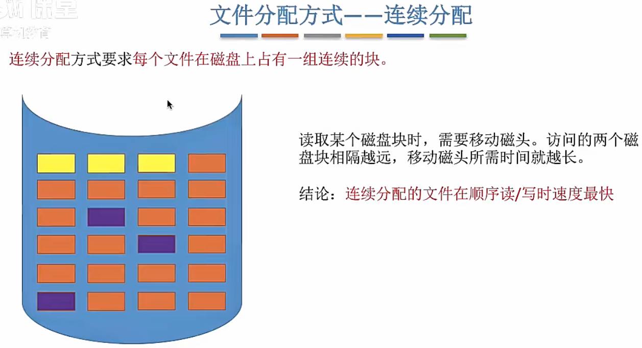 再来分析连续分配方式的第二个优点,这个地方需要用到一个现在暂时还没有讲过的知识点。磁盘这种硬件想要读取一个磁盘块的时候,需要把磁头放到磁盘块相应的位置,而访问不同的磁盘块是需要移动磁头的,并且如果两个磁盘块的距离越远,移动磁头所需要的时间就越长。比如说我现在需要连续的读这三个黄色的块,首先是把磁头放到第一个块的位置,之后移动到第二个块的位置,再之后移动到第三个块的位置,所以由于这三个块它们之间在物理上是相邻的,也就是它们相距距离是最短的,因此这个移动的过程其实磁头的移动距离也是最短的。而假如我们此时想要读取的是紫色的这三个磁盘块的话,首先需要把磁头移动到第一个这个块对应的位置,读完了第一个块之后,需要移动磁盘,移动到第二个位置,读完第二个磁盘块之后,也需要再移动磁盘,然后把它移动到第三个块的位置。因此如果这些块不相邻的话,读取一个块和下一块之间所需要的移动磁头的时间就会更长,因此基于这个分析我们知道,如果一个文件采用的是连续分配的方式的话。我们在顺序的读取这个文件的各个块的时候,所需要的读写时间是最短的,读写速度是最快的,因为整个过程所需要的磁头移动距离是最短的。这个知识点还会在之后再进行进一步的探讨,这个地方只需要理解连续分配的文件在顺序读写的时候速度最快,只需要理解这一点就可以了。这是连续分配方式的第二个优点。