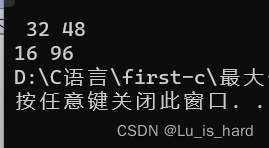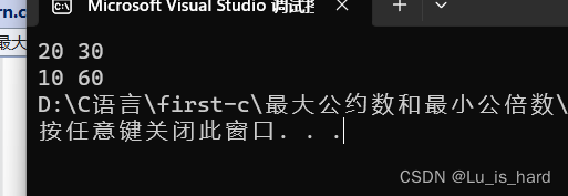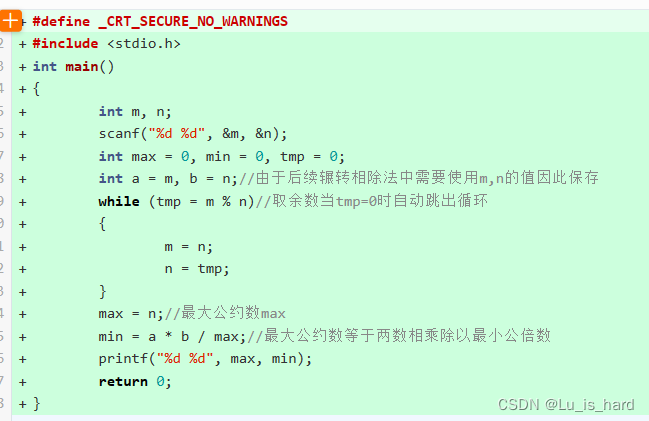 该程序唯一的难点在于如何实现辗转相除法,在上述程序中采用了while循环的方式。我们知道在计算机语言中0表示假非零表示真,所以当tmp=0是自动跳出循环。