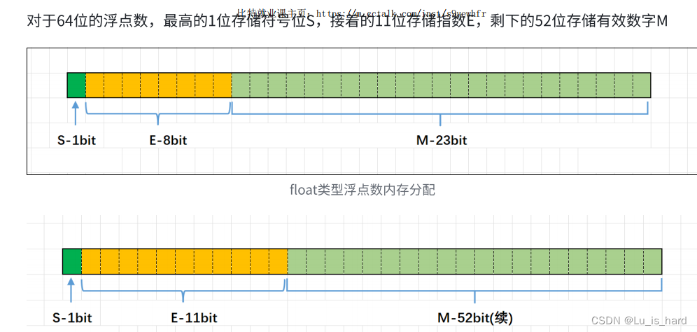 对于32位的浮点数,最⾼的1位存储符号位S,接着的8位存储指数E,剩下的23位存储有效数字M