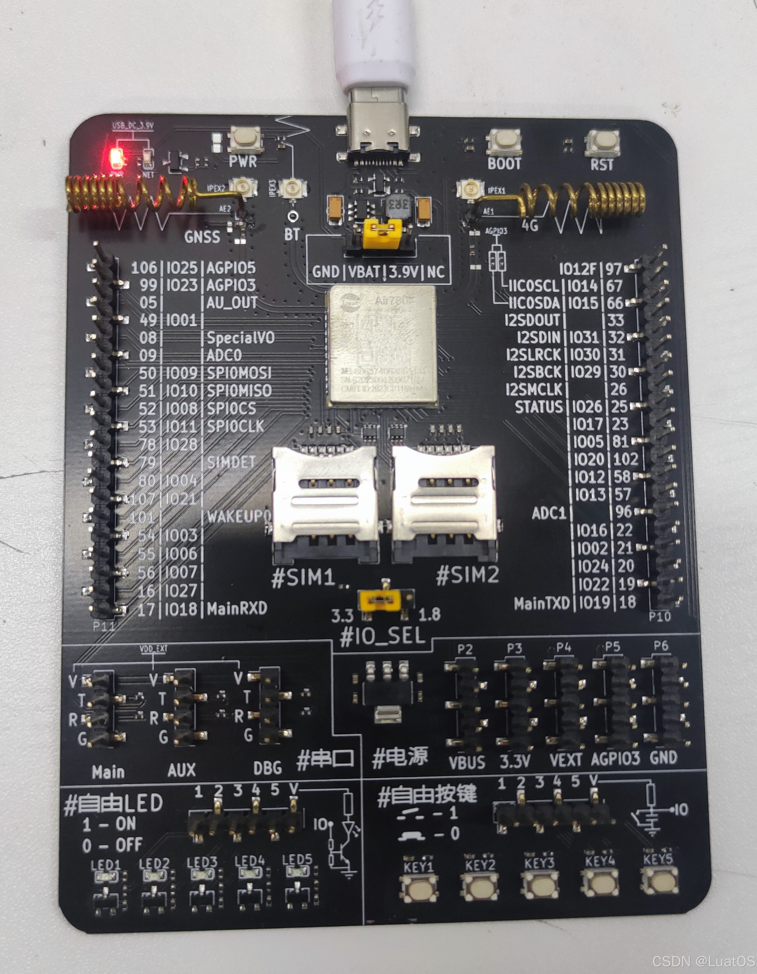 1、确认开发板状态:确保Air780E开发板已连接电源,并通过长按pwrkey键1.5秒,使其进入开机及可编程状态。